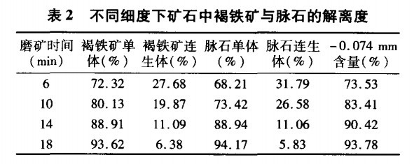 表2 不同細(xì)度下礦石中褐鐵礦與脈石的解離度