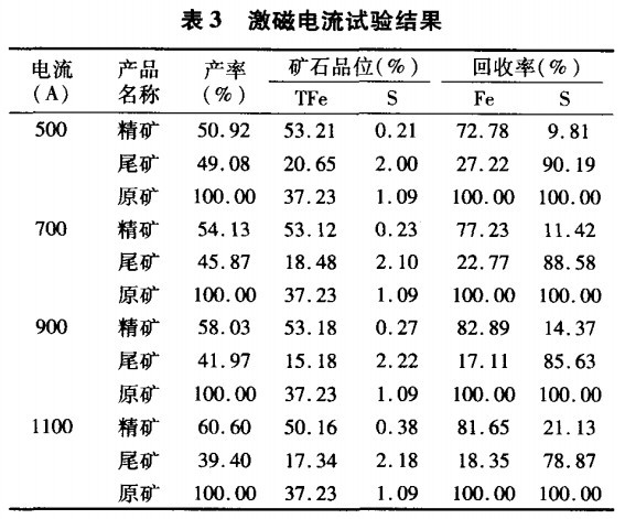 從表3結(jié)果可見,激磁電流從500A增加到900A時(shí),精礦鐵品位和回收率都隨之增加,硫的品位降低。但當(dāng)激磁電流達(dá)到900A以后,繼續(xù)增大激磁電流。鐵精礦回收率增加,但品位卻隨之下降,而且鐵精礦中硫的品位大于0.3%,所以綜合考慮,選礦試驗(yàn)采用900A比較合適。
