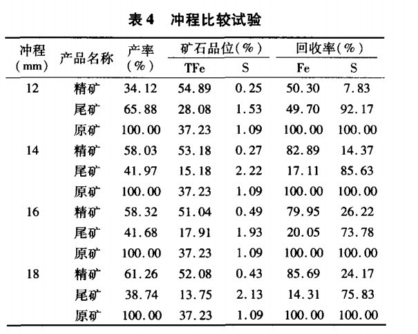 從表4可以看出,沖程在14mm指標(biāo)較好。說明沖程在14mm的時(shí)候,各產(chǎn)品得到了較好的松散,在這種磁場(chǎng)作用下,精礦的產(chǎn)率達(dá)到58.03%,回收率達(dá)到了82.89%,*終硫在精礦里面的品位只有0.1%左右,達(dá)到了國(guó)標(biāo)要求。