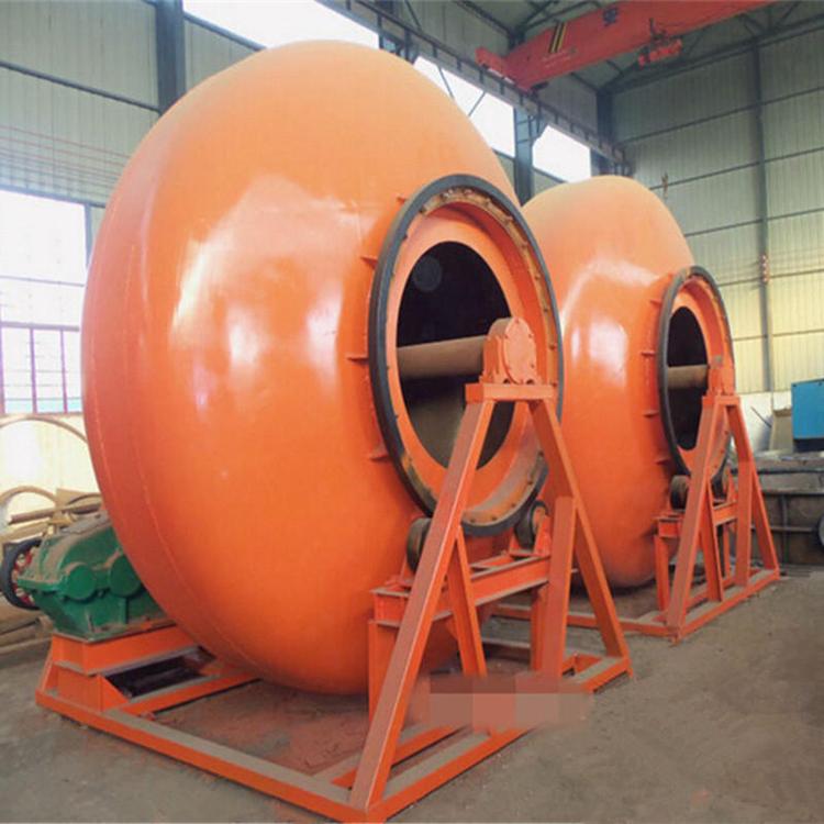 鍋式制粒機(jī)的工作原理是傳動(dòng)裝置通過(guò)過(guò)橋裝置帶動(dòng)筒體旋轉(zhuǎn),且筒體軸線與水平面呈特定夾角;當(dāng)粉料通過(guò)進(jìn)料口加入筒體內(nèi)后,開(kāi)始向筒體內(nèi)部噴水,濕潤(rùn)的粉料在翻滾的同時(shí),逐漸形成球核,表面濕潤(rùn)的球核在不斷翻滾、摩擦、碰撞下,逐漸長(zhǎng)大成粒,當(dāng)粒徑達(dá)到要求時(shí),通過(guò)卸料門(mén)將其卸下。